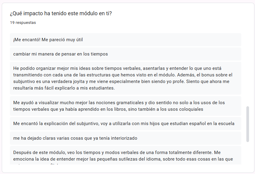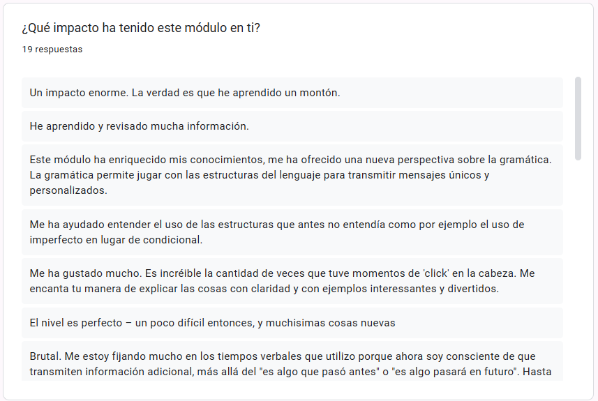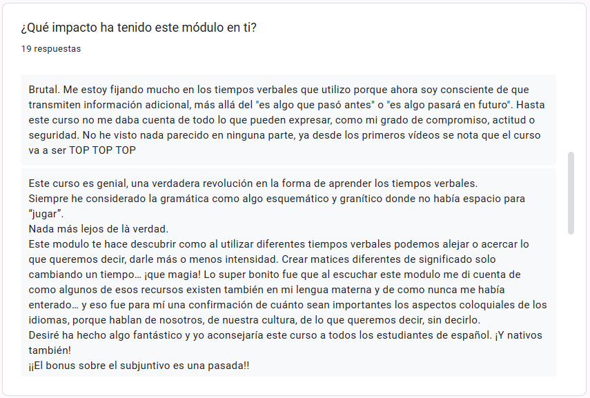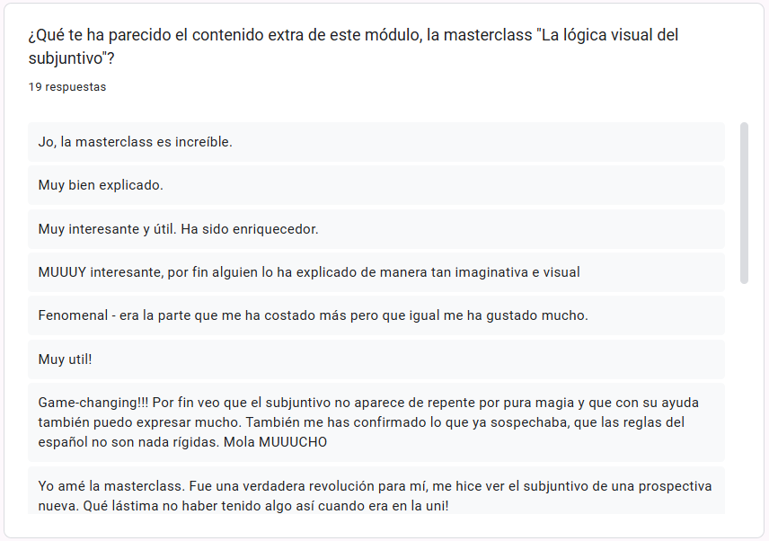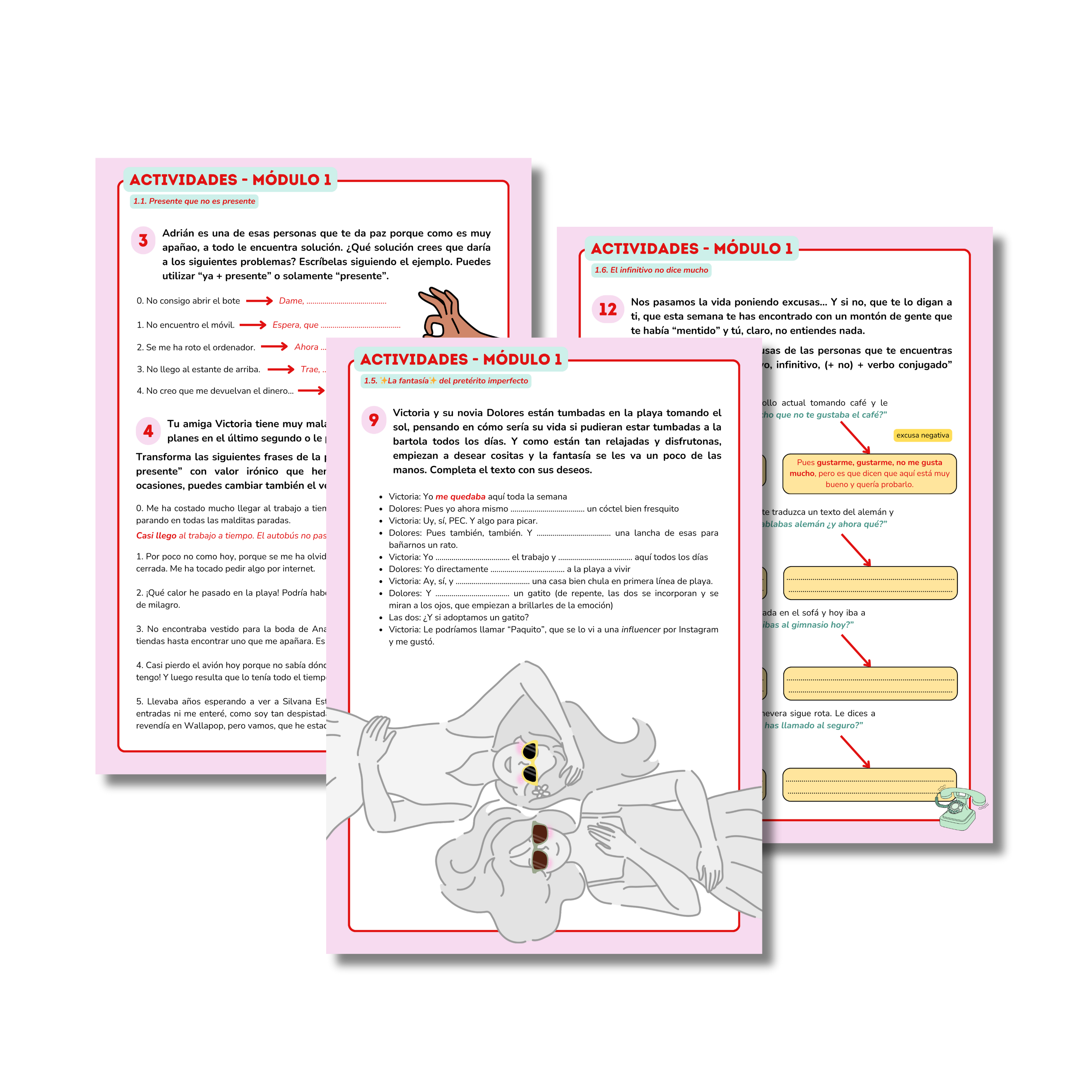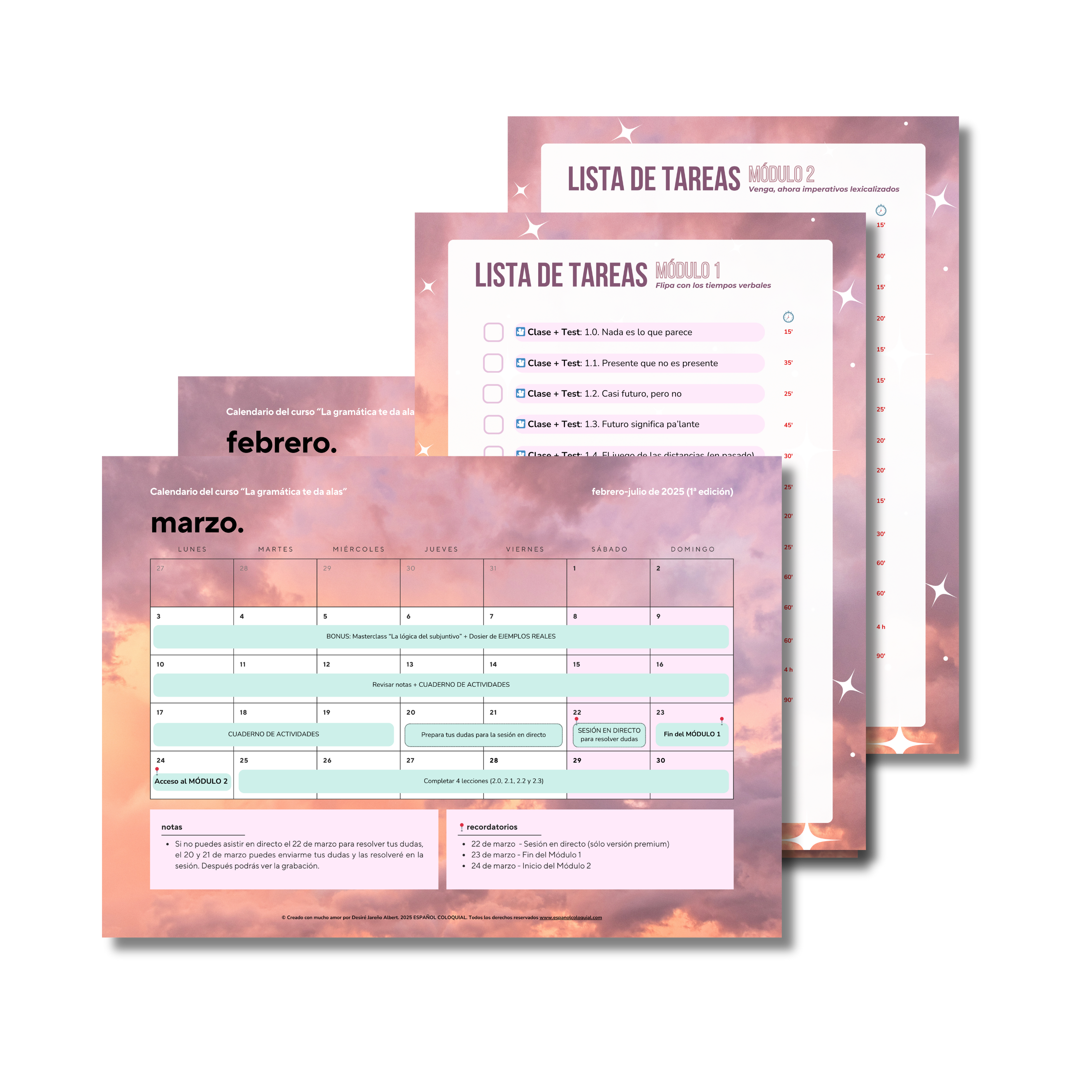 Actividades extra o masterclass para ampliar tu conocimiento sobre el contenido de los módulos: la lógica visual del subjuntivo y de los pasados, el orden de las palabras, estructuras coloquiales y muchas cositas más.